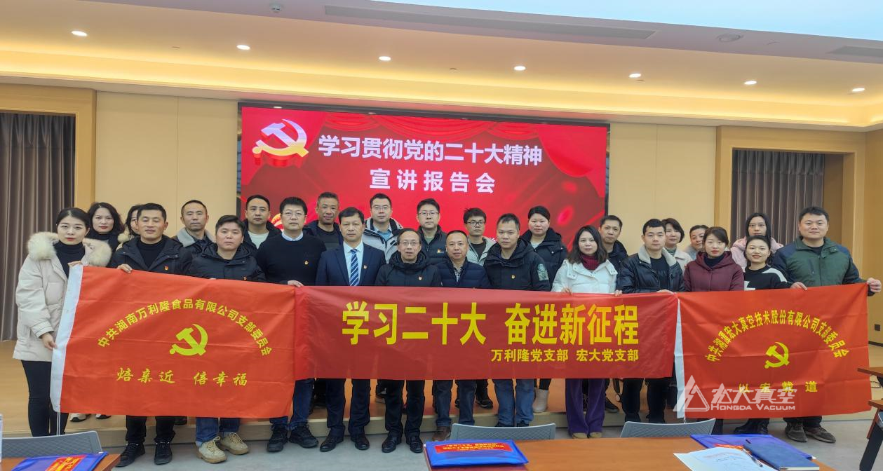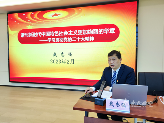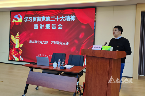 根據(jù)湘潭經(jīng)開區(qū)兩新組織黨委關(guān)于學(xué)習(xí)貫徹黨的二十大精神的要求,2023年2月3日,湘潭宏大真空黨支部組織在公司多功能廳召開學(xué)習(xí)貫徹黨的二十大精神宣講報告會。特邀湘潭市委宣講團(tuán)成員、市貿(mào)促會黨組書記、會長戴志強(qiáng)作宣講報告,市派黨建指導(dǎo)員歐陽秀奇出席會議,宏大真空黨支部全體黨員、入黨積極分子、公司高管、職工代表以及萬利隆黨支部黨員代表參會。會議由宏大真空黨支部副書記潘繼峰主持。